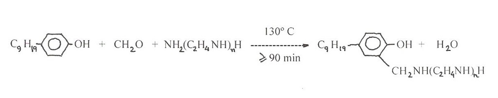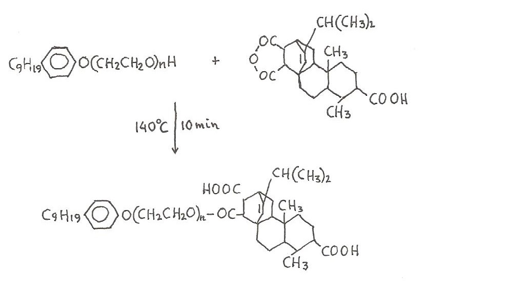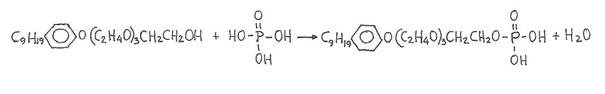 También se han empleado para la activación de algunos betunes asfálticos compuestos con grupos carboxilo, como el ‘tall oil’, los ácidos nafténicos y la colofonia; pero conociendo la debilidad frente al agua de estos ácidos y sabiendo que los derivados del ácido fosfórico mejoran las propiedades de los betunes, el autor de este artículo sintetizó, hacia 1997, un polímero orgánico para emplearlo como agente de adhesividad. El procedimiento de obtención de este activante consistió en la reacción de cantidades equimoleculares de nonilfenol con cuatro moles de óxido de etileno (NF – 4moe, 396 g/mol) y de ácido ortofosfórico (al 75 %, 132g), que equivalen, respectivamente, al 75 y al 25 % en peso de los reactivos. La reacción se produce calentando la mezcla a 170 – 175º C durante unas dos horas, perdiéndose unos 10 gramos de agua por 100 gramos de mezcla , de acuerdo con la reacción: