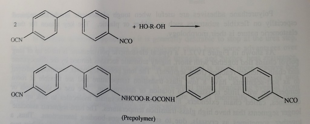 Por su naturaleza de elastómero, los adhesivos de poliuretano se emplean para sustratos flexibles como la goma o el plástico. Muchos de ellos se hacen con prepolímeros fabricados por reacción de un exceso de diisocianato con un poliol, por ejemplo, en la proporción 2:1 de NCO : OH para minimizar la cantidad de diisocianato monómero, como en la reacción que se expone entre el MDI y un diol: