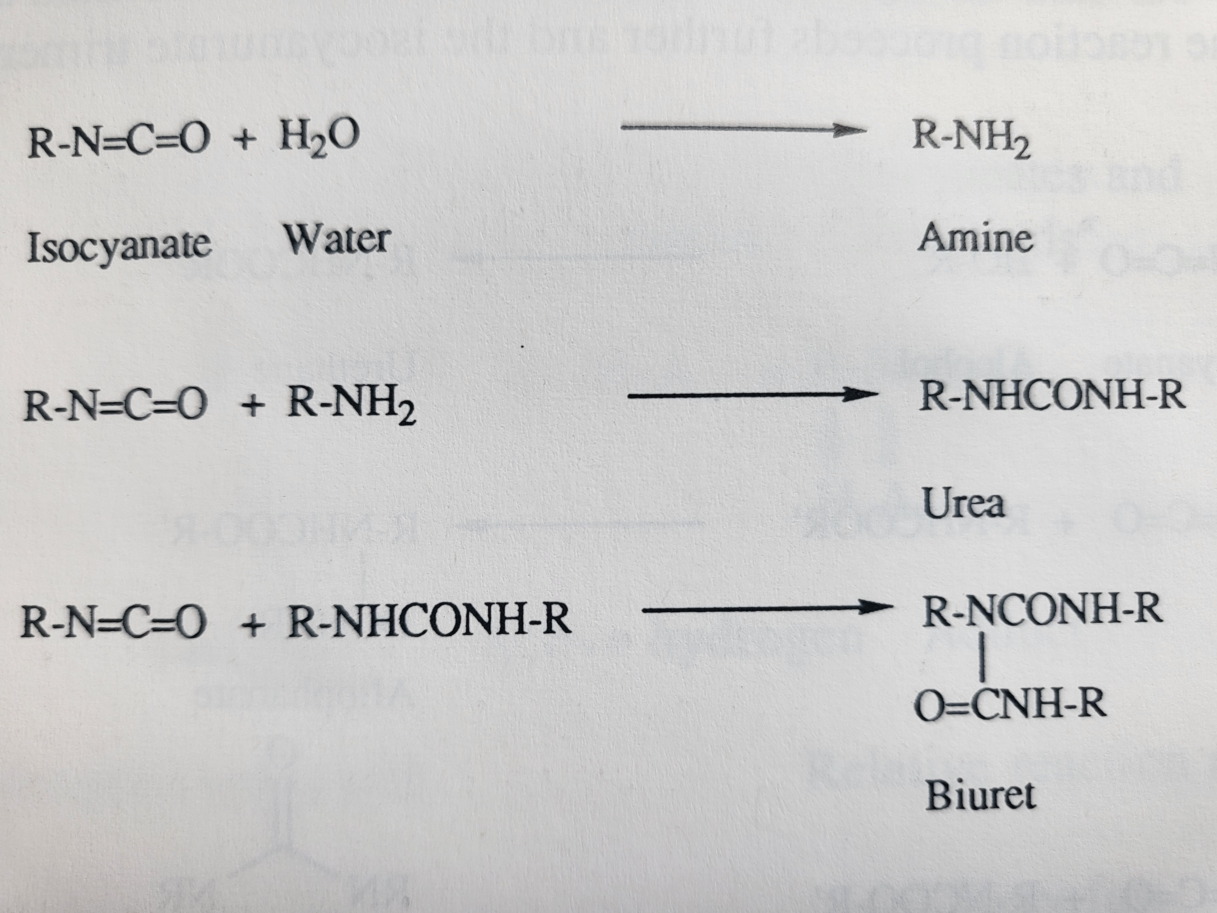 La reacción entre el isocianato y el agua da amina y , posteriormente, urea y biuret: